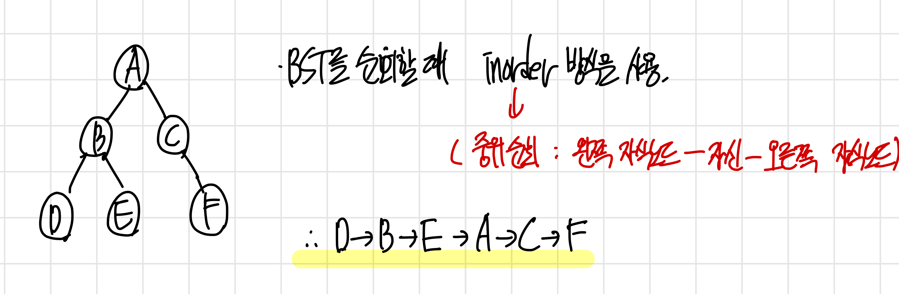 왼쪽 노드(서브트리) → 자신 → 오른쪽 노드(서브트리) 로 순회하면 해당 BST 에서 정렬된 결과를 얻을 수 있다