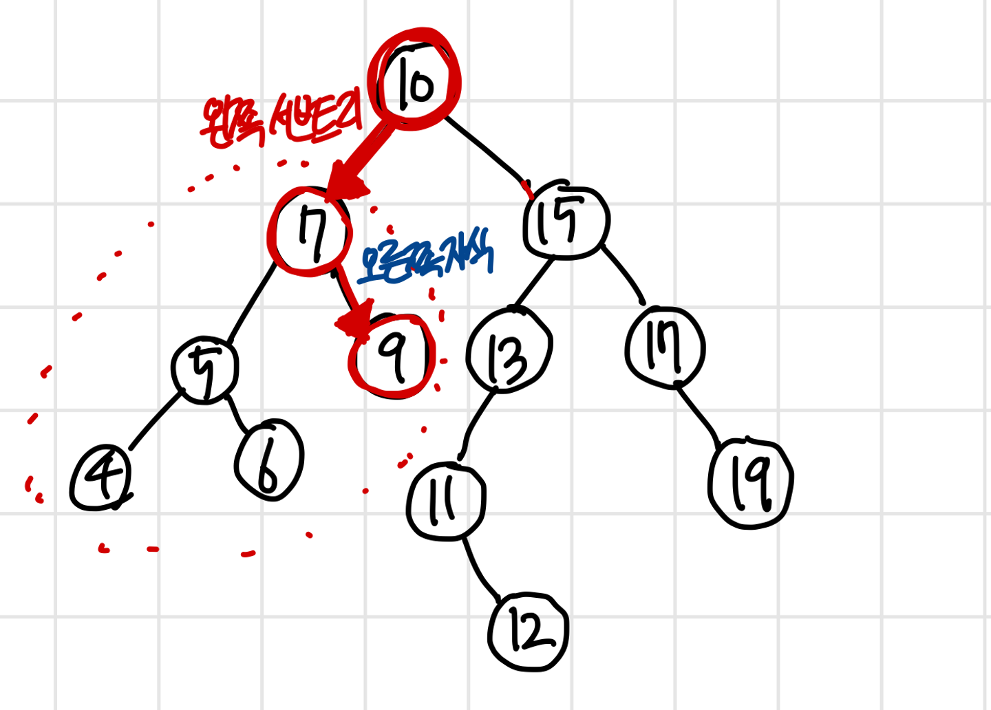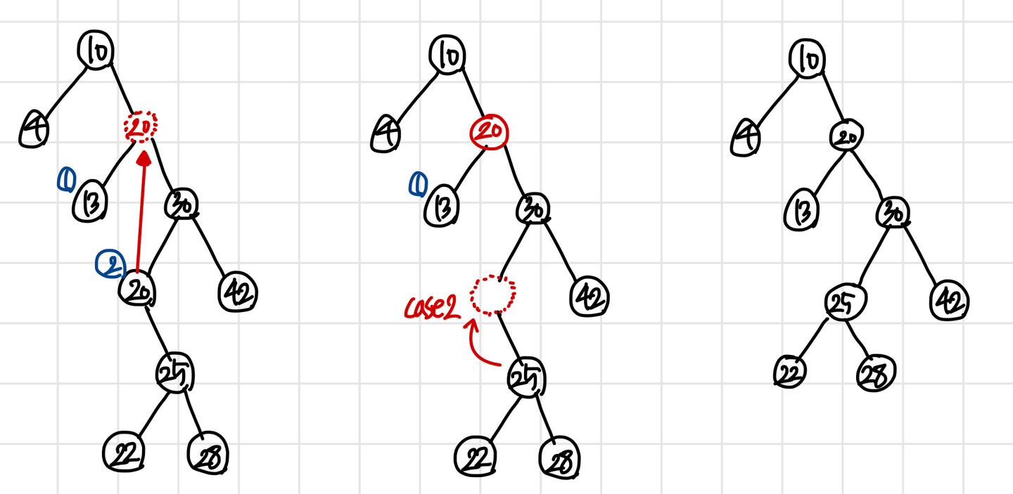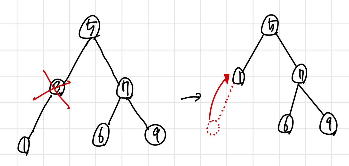 따라서, 왼쪽 자식이 더이상 존재하지 않는 경우 오른쪽 자식만 있거나, 오른쪽 자식도 없는 두 경우가 존재한다