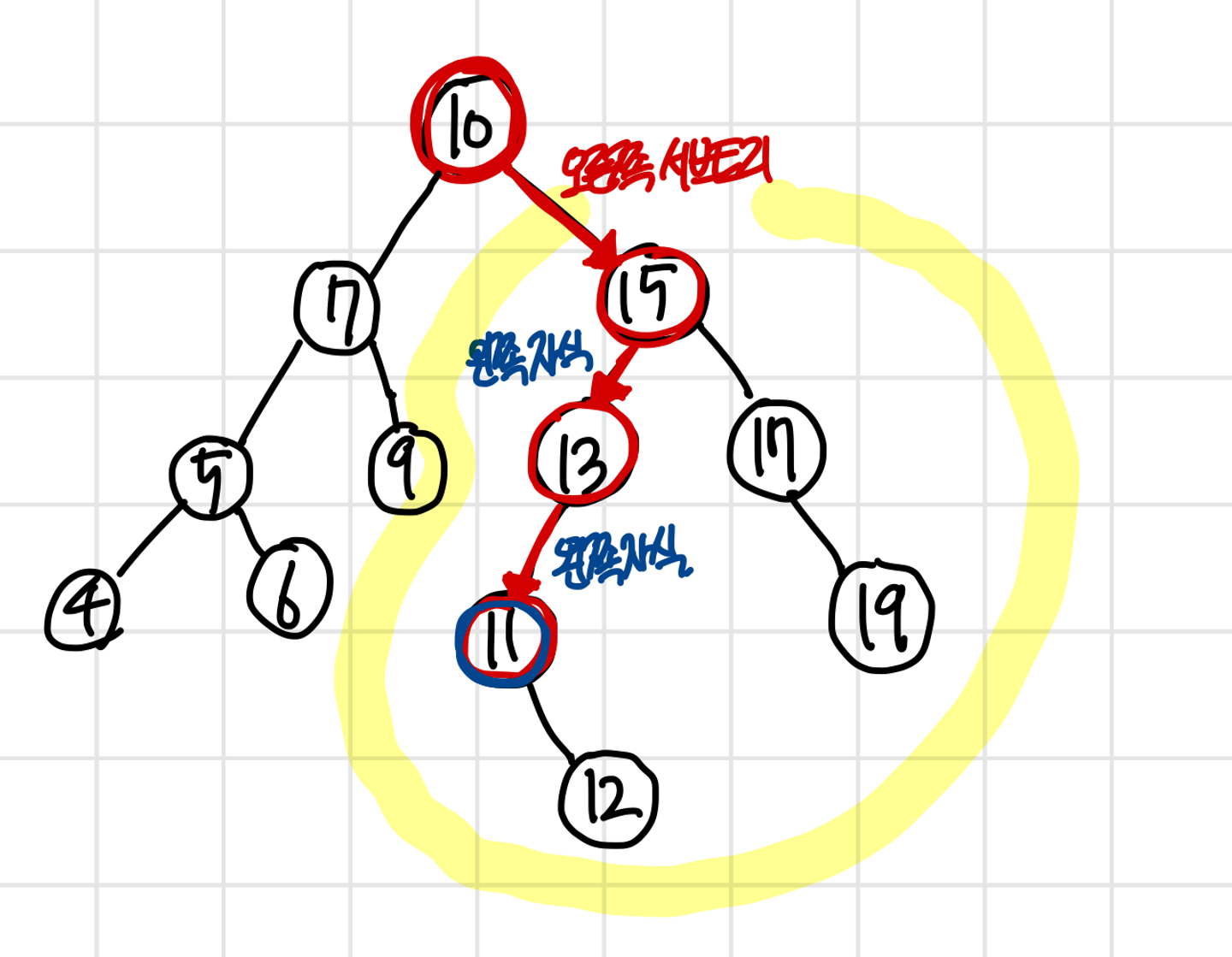 - 왼쪽 서브트리의 루트 노드에서 계속 오른쪽 자식들을 탐색해 나가는 과정은 특정 노드 보다 작지만, 가장 가까운(왼쪽 서브트리 중에서) 노드를 찾기 위한 연산이다