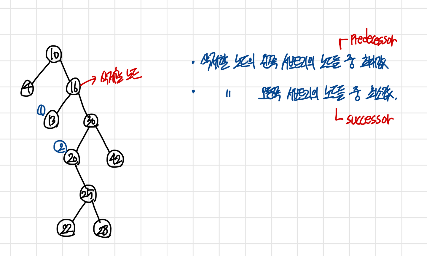 삭제할 노드의 왼쪽 서브트리 노드들 중 최대값 → predecessor