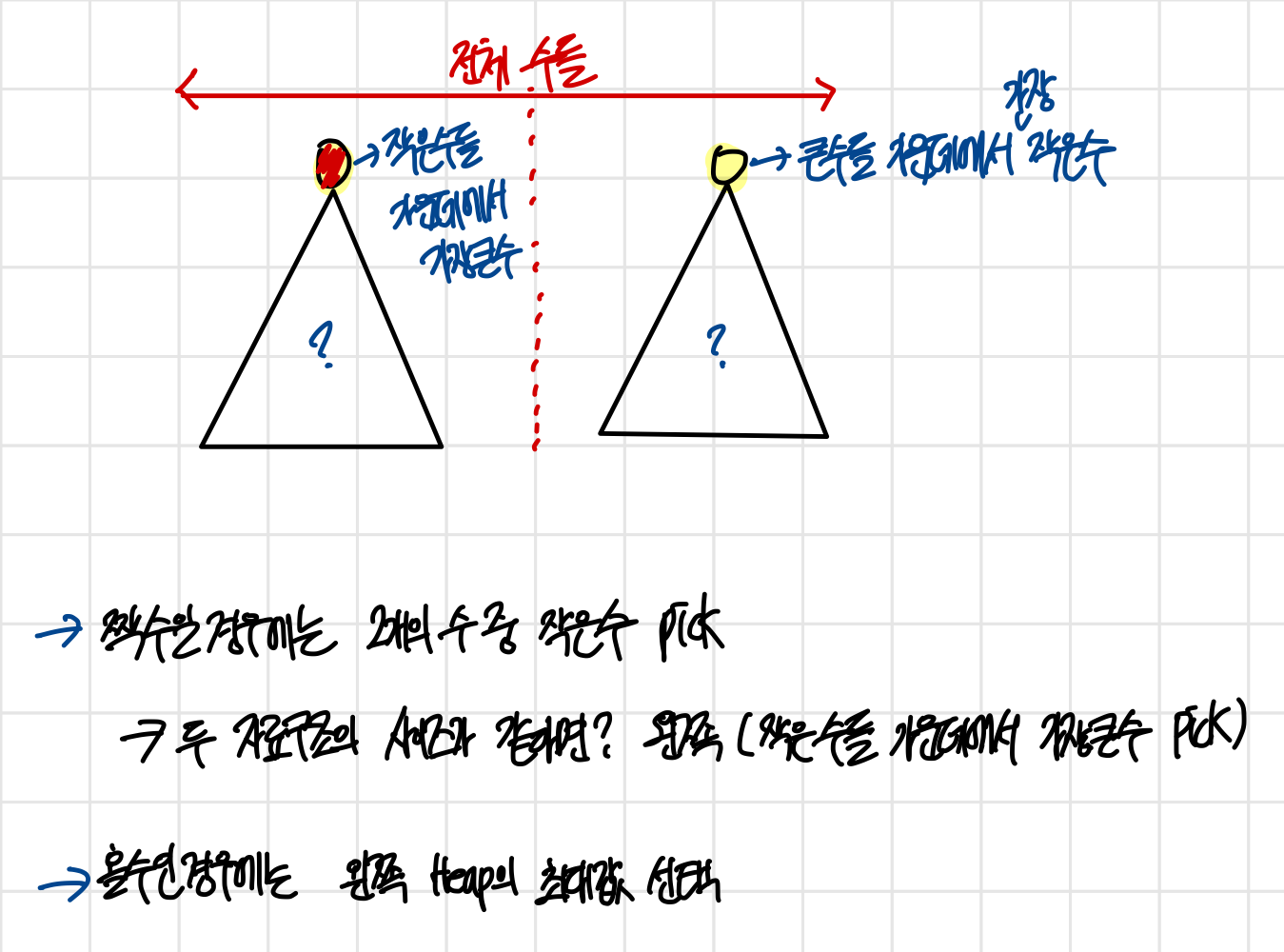 - 최소 힙(오른쪽)에 작은 값(반으로 나눴을 때 작은 쪽에 있는 값)이 들어간 경우 루트에 해당 값이 존재할 것임 (가장 작은 수)