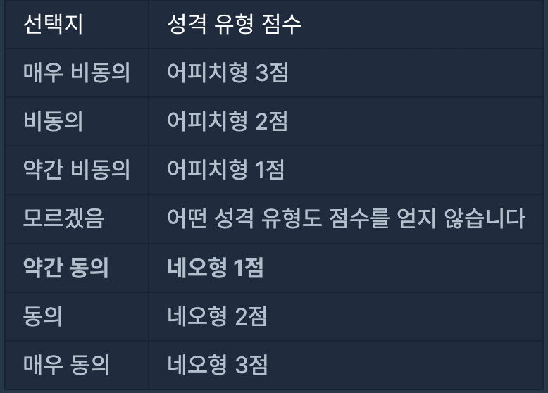 에 해당하는 문자열을 넣고, 우리가 흔히 아는 MBTI처럼 각 지표별로 두가지 성격 유형 중 한가지를 택하게 된다