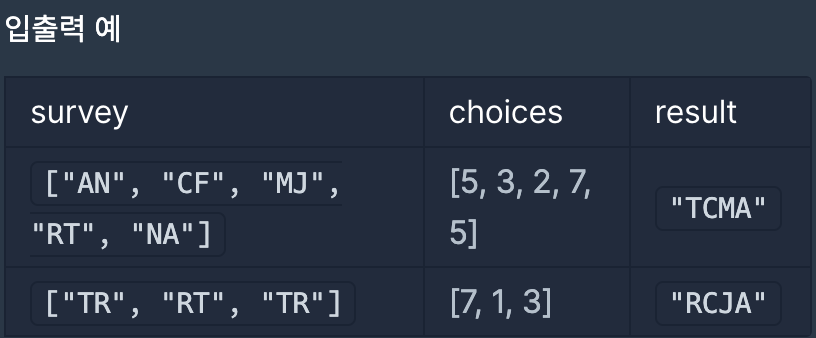 [choices]는 각 [survey]의 원소들에 해당하는 선택지 즉, 매우 비동의 ~ 매우 동의까지 7가지의 선택지가 존재하고 예를 들어, 입출력 예시 첫번째 경우에서 "AN" 의 choices는 5 이므로, N(네오형)이 1점을 획득하게 되는 것이다