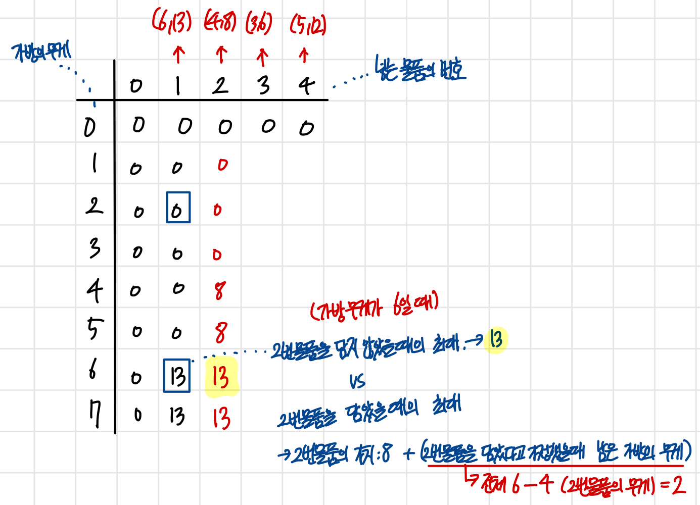 2번 물품을 담지 않았을 때의 최대는 바로 왼쪽 (dp[6][1])을 의미한다. -> 13