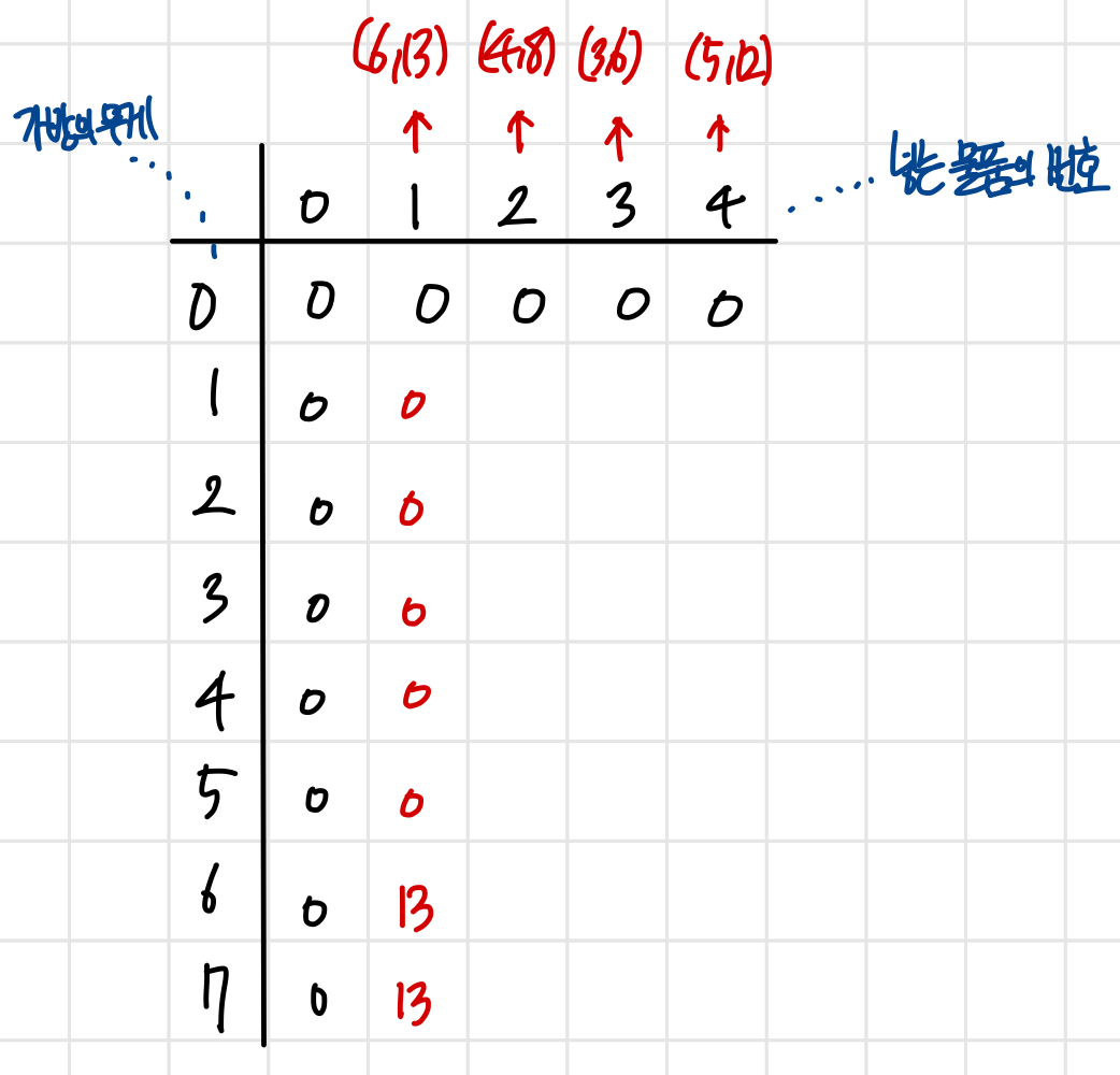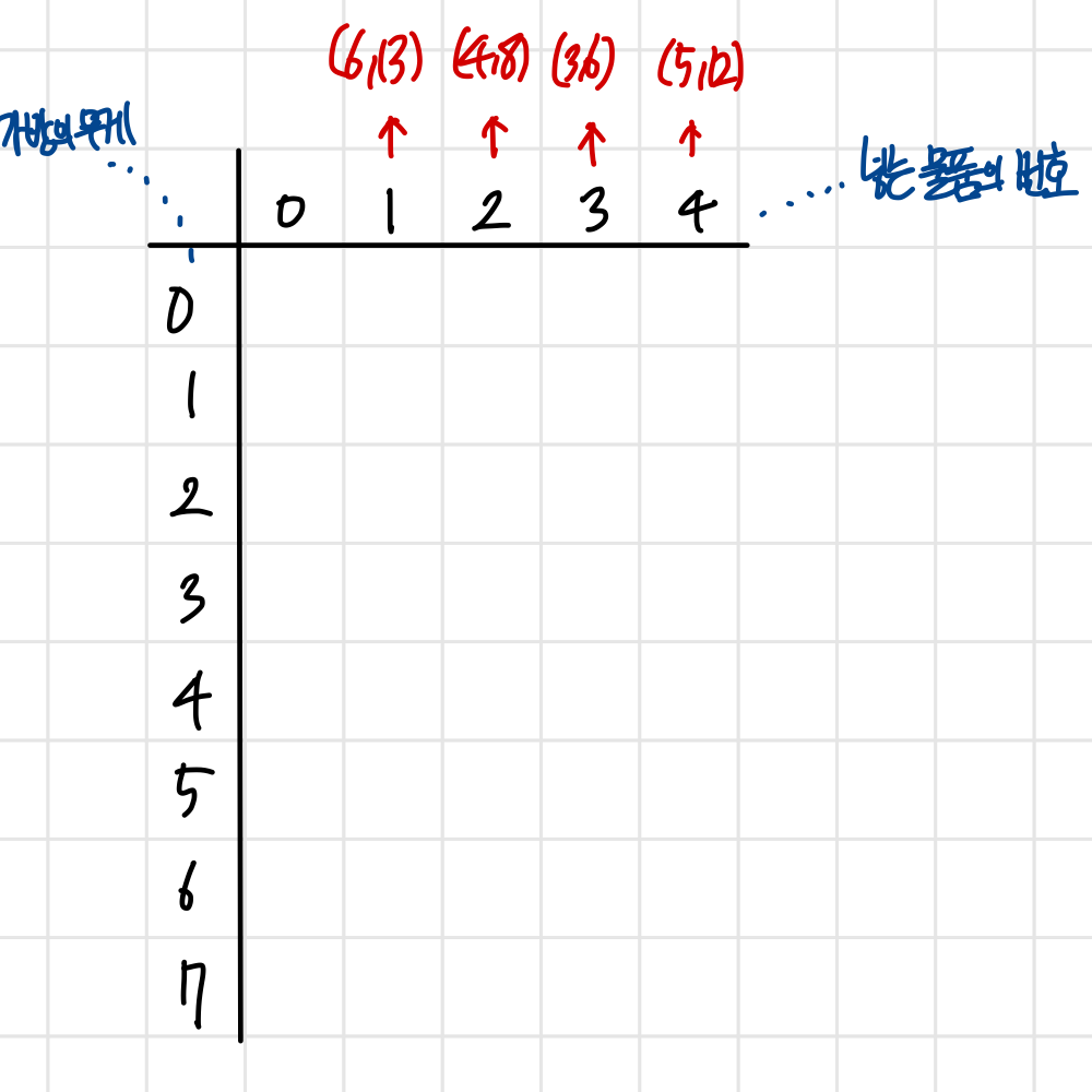 각각의 행은 가방의 무게를 뜻한다. 총 7까지의 무게를 담을 수 있는 가방이기 때문에 0부터 7까지를 기록해 놨다.
