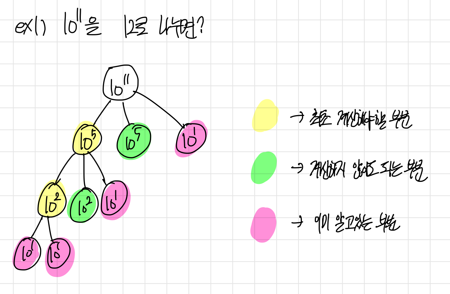 이는 (a=b+c일 때) X^a = X^b * X^c 라는 수학적 공식을 사용하여 전개한 것이고, 이 식에서 지수 a가 짝수라면 지수가 a/2 인 두개의 수의 곱으로 표현되며 지수가 홀수라면 지수가 a/2 인 두개의 곱과 지수가 1인 수, 총 3개의 수의 곱으로 나타낼 수 있다.