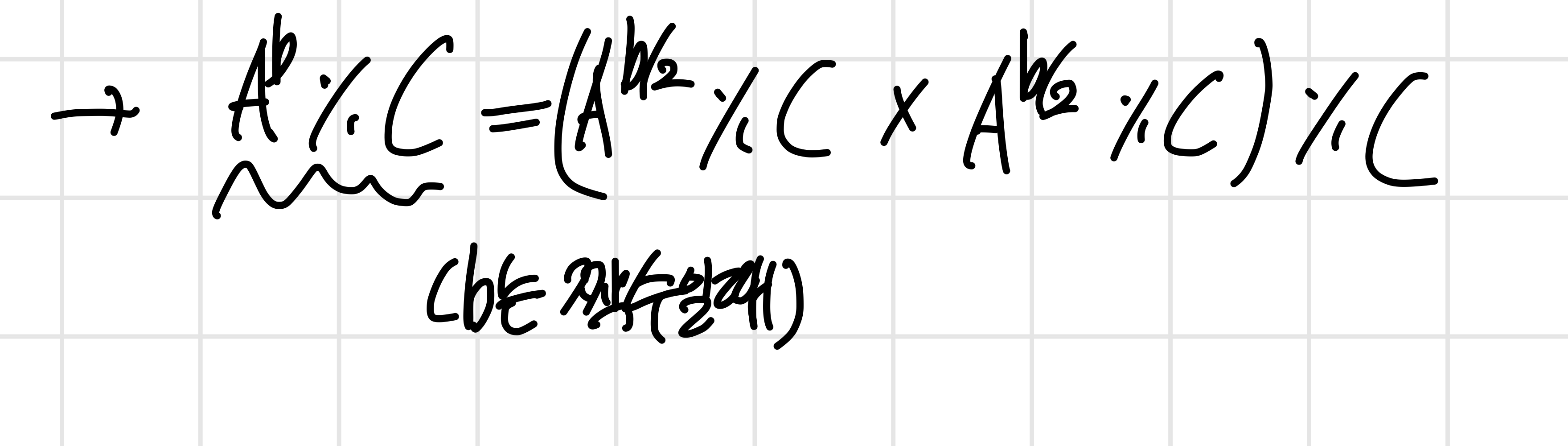 어쩌면 모두가 이미 알고 있을 공식일 수도 있는데, 이는 두 수(a, b)의 곱을 C로 나눈 나머지는 각각의 수를 C로 나눈 나머지를 다시 C로 나눈 나머지 라는 것이다.