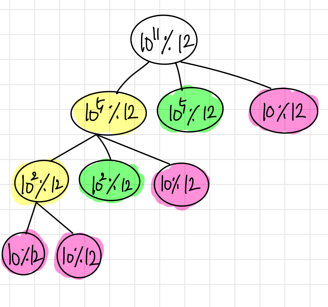 예시를 보면, A=10, B=11, C=12이다. 실제로는 이 수들을 나눈 나머지를 구해야 하지만, 예시를 들기 위해 나머지를 구하는 부분은 제외하고 설명해 보자면 위 그림과 같을 것이다.