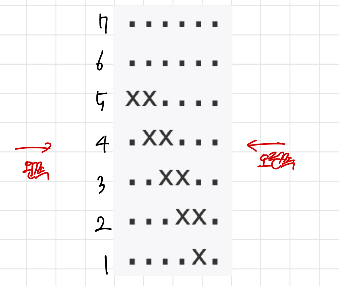 막대기를 던질 때에는 높이가 주어지며, 던지는 방향에서 맞는 첫번째 미네랄은 파괴된다.