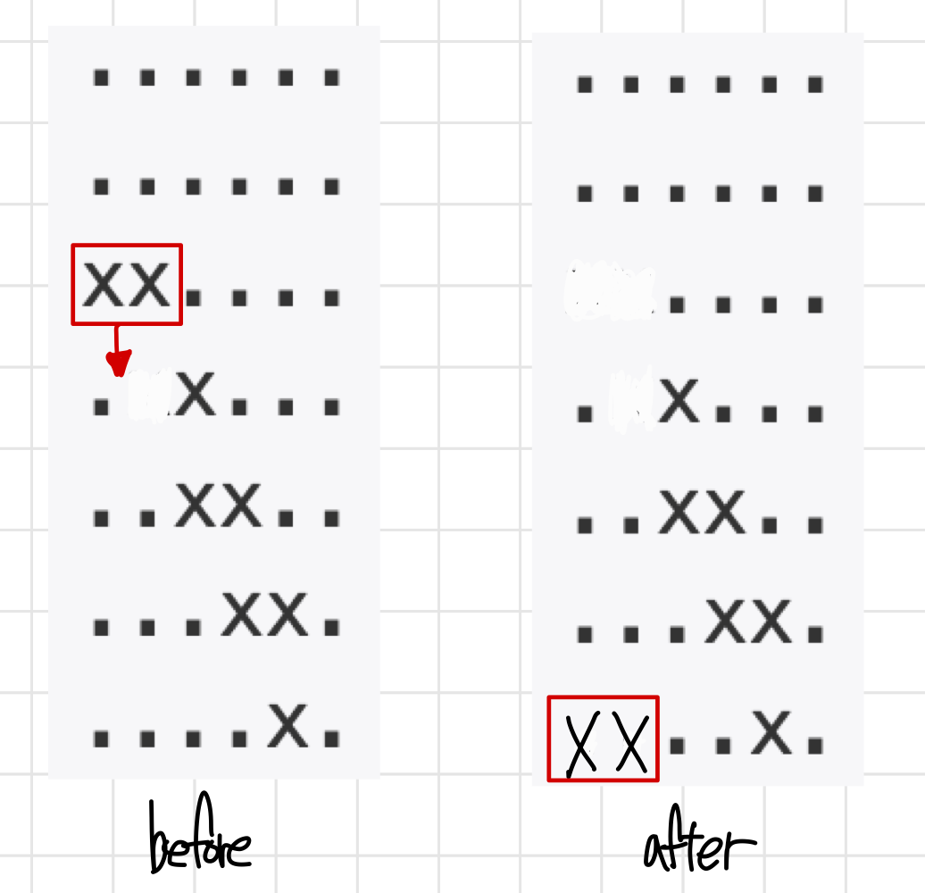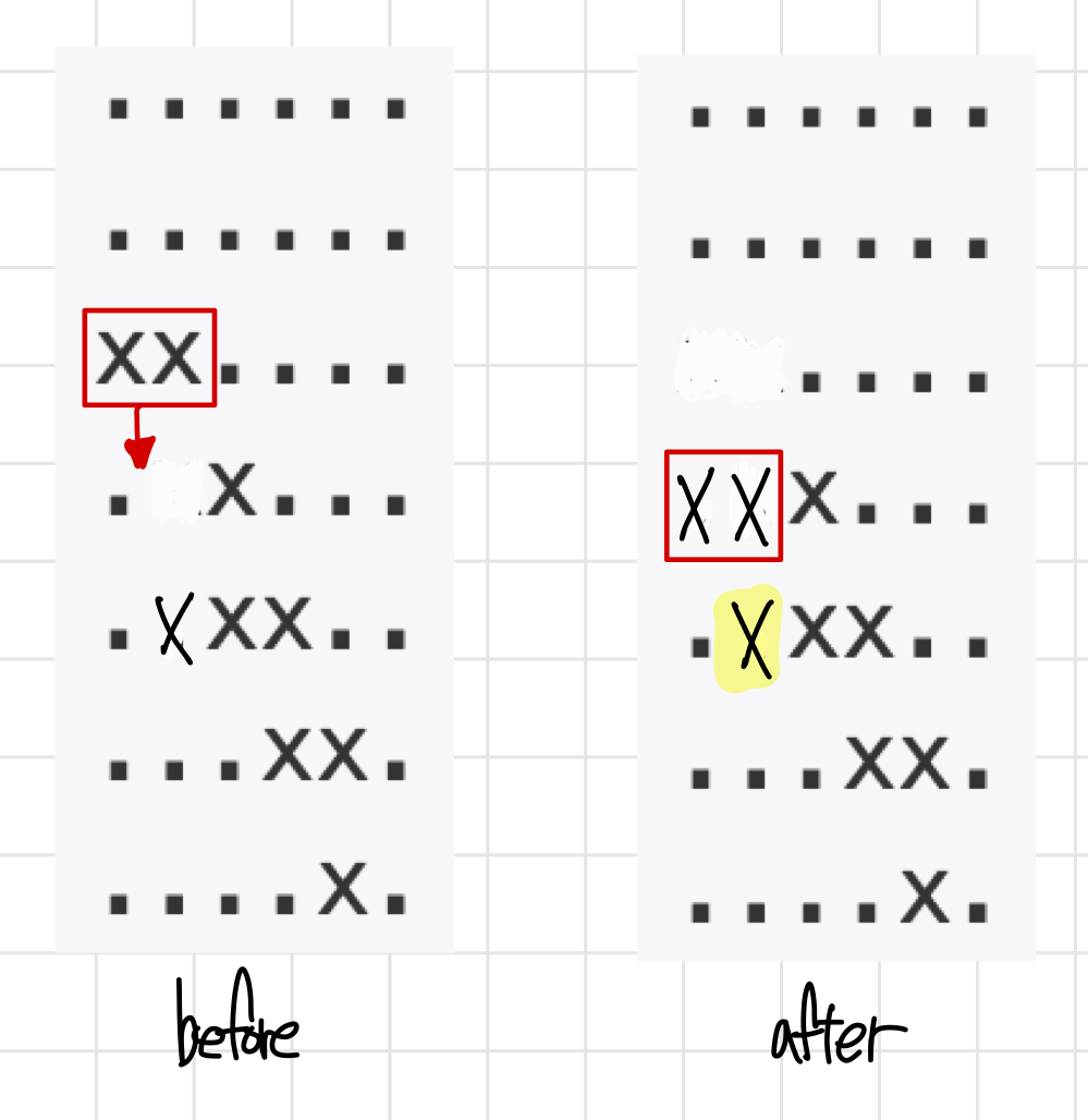 두개의 칸을 가진 클러스터가 아래로 떨어져서 after 과 같은 결과가 만들어졌다.