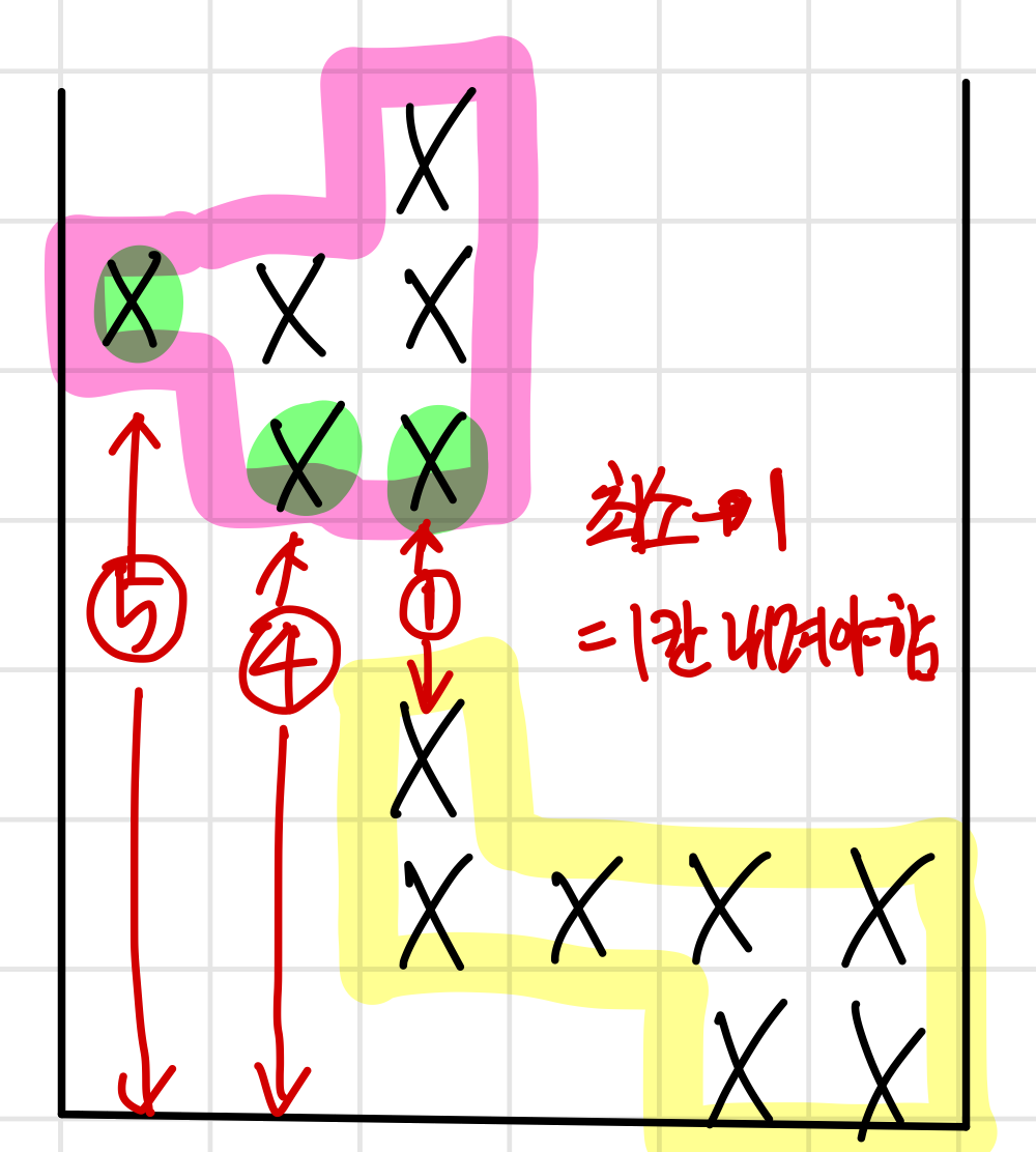 분리된 클러스터(분홍)의 각 열의 가장 바닥부분(초록)이 바닥 혹은 다른 클러스터의 위에 닿을 때까지 내려야 하며, 어떠한 열이든 닿았다면 더이상 이동하지 않아야 하므로,