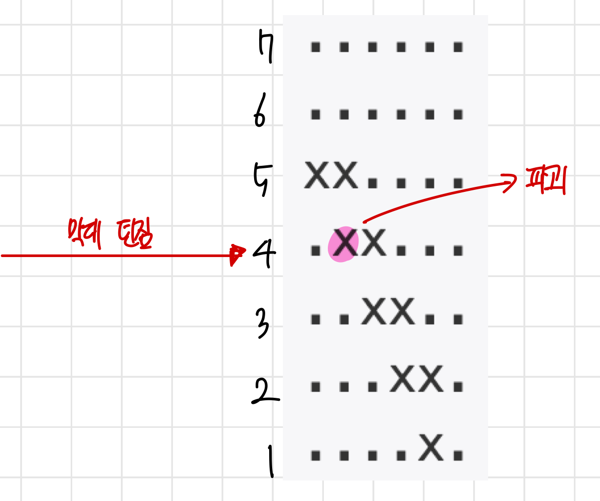 만약 높이 4에서 첫번째로 막대를 던졌다면, 분홍색 형광펜이 있는 위치의 미네랄 하나가 파괴되는 것이다.
