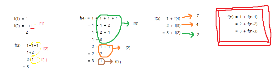 그 중에서 1을 더하면 f(n-1), 2를 더하면 f(n-2), 3을 더하면 f(n-3)의 세가지 경우로 나누어진다