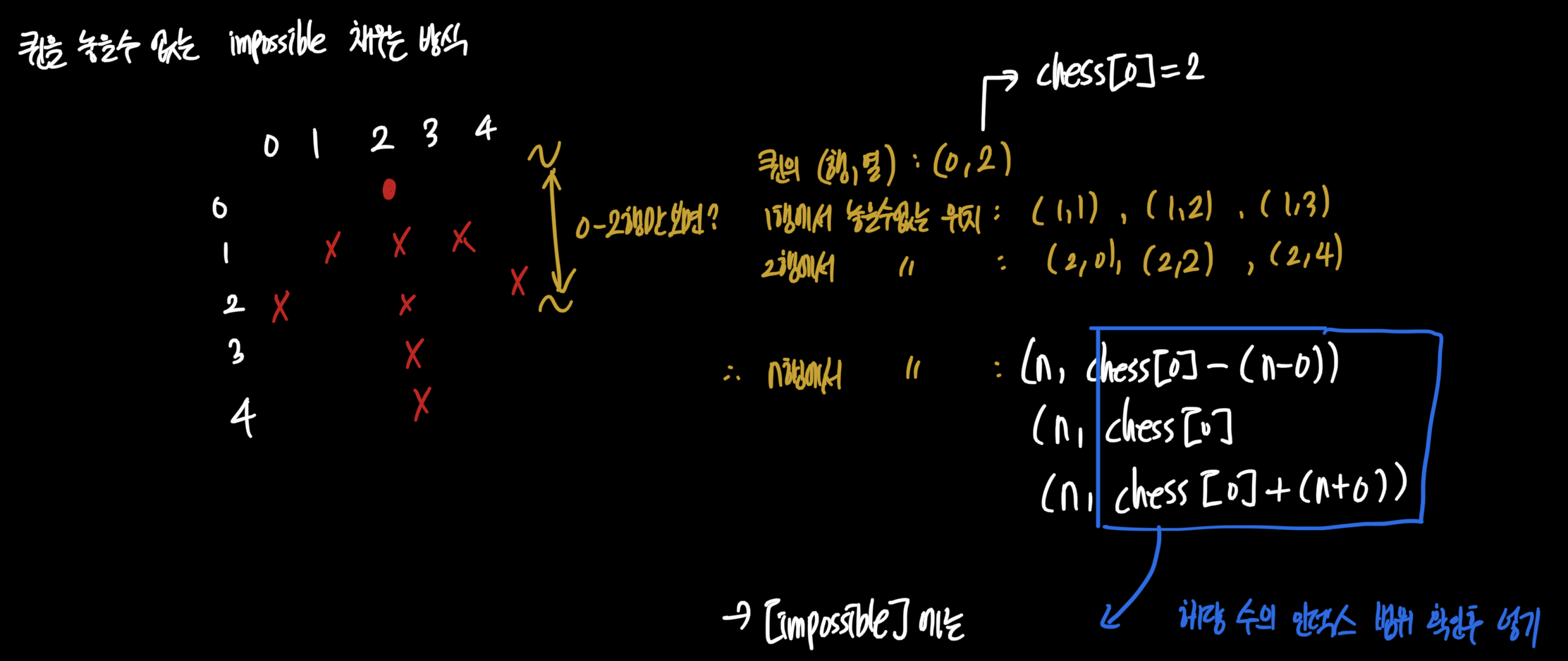 퀸을 놓을 수 없는 위치는 규칙을 파악하여 풀이할 수 있었다