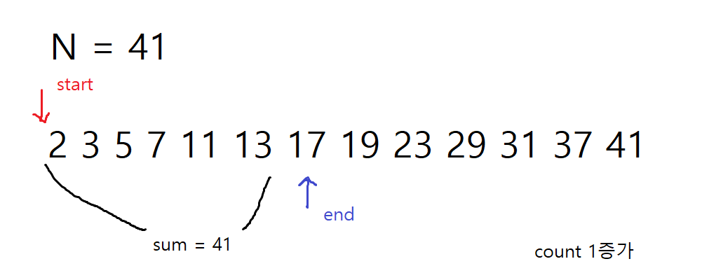 primes[0] ~ primes[5] 까지의 합이 41(target number와 같아지는)이 되는 지점이 등장하고 count를 1 올려준다