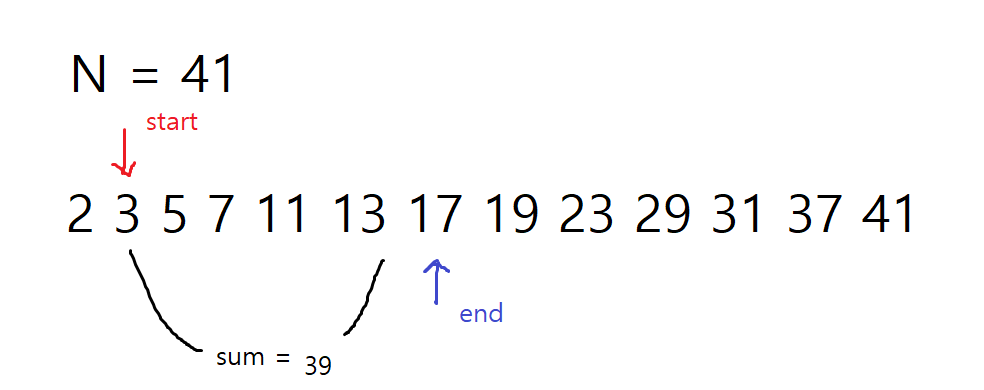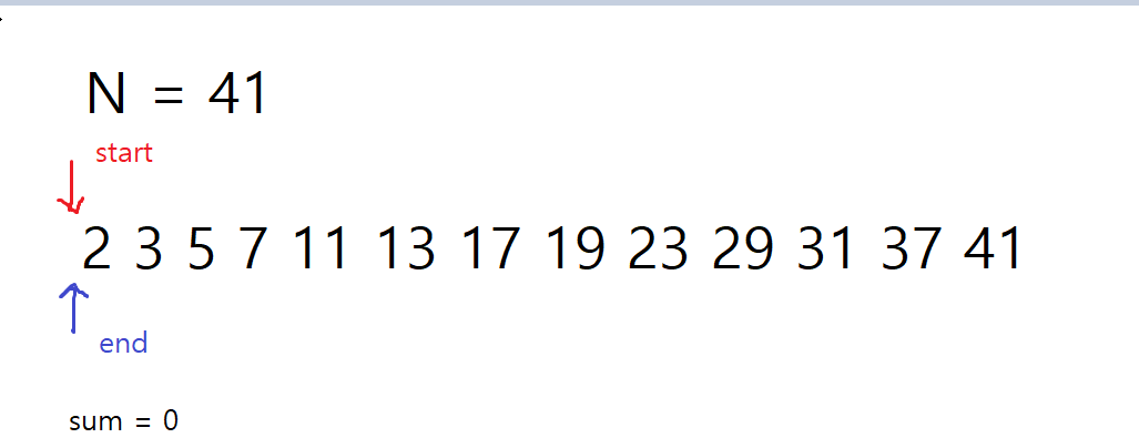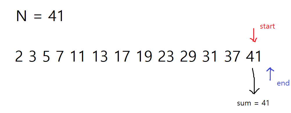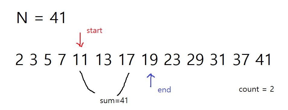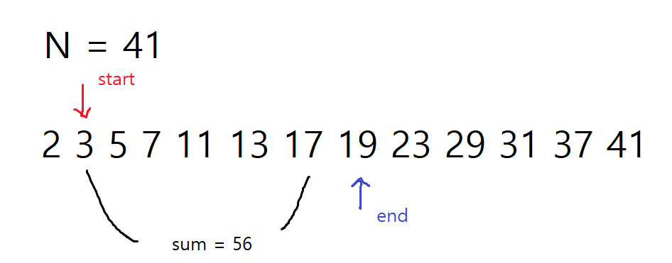 예시는 이전에 백준 알고리즘 1644번: 소수의 연속합 문제에 사용되었던 투 포인터 알고리즘을 사용한 풀이에서 예시를 들어 설명하도록 하겠다