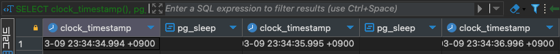 clock_timestamp() 의 실행 사이 사이에 약 1초정도의 지연이 존재하는 것을 볼 수 있다